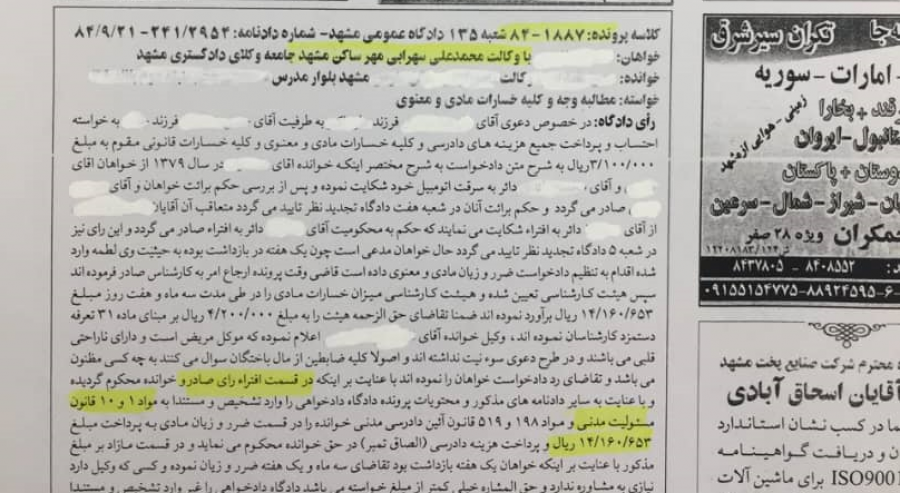 پرونده مربوط به سال 1389 میباشد، در اين پرونده همسر موكل به لحاظ عدم تشخيص به موقع پزشكان فوت مي كند. تشخيص علت فوت توسط پزشكي قانوني عفونت شديد ناشي از اپانديسيت اعلام مي شود.